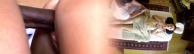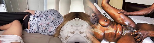 Blonde gives a massage to giant black jock before passionate sex