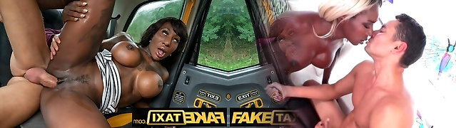Faux Cab Busty ebony Josy Black wearing bright red lingerie makes sexual advances on the driver