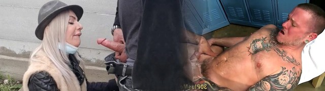 Blonde mega-slut sucks my manmeat in front of his bf for cash