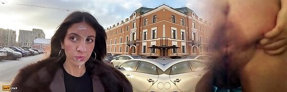Perverted Russian slutty honey Katty West jerk off a stranger in a car and got his pleasure gel on a face