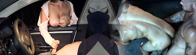 Voyeur in the car on a rest area, I masturbate him off with my breasts, empty his balls, he uses me like a biotch and splatters in my facehole