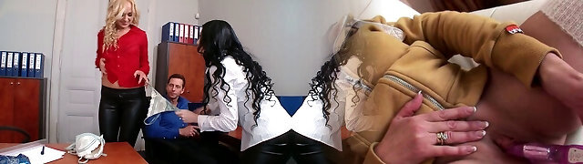 Anal hos licking poon and toy fucking in the office in FFM threeway
