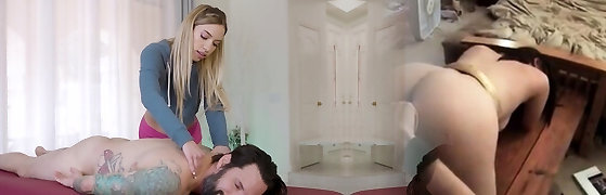 Fabulous blonde MILFie masseuse India Summer luvs doggy fuck during massage