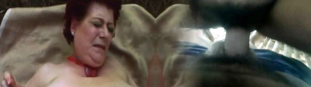 Red-haired granny fucked hard in outdoor action