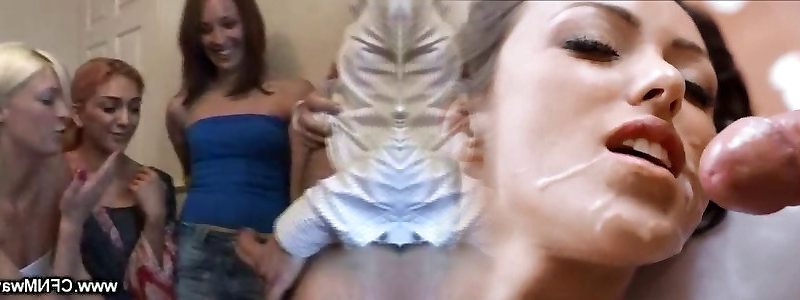 Steamy cfnm stunners lucky in getting cum from this boy