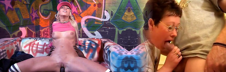 Towheaded girl with elastic bum fellates 2 black bones