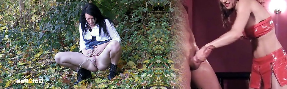Wild black-haired sinfully urinates on the park path outdoors