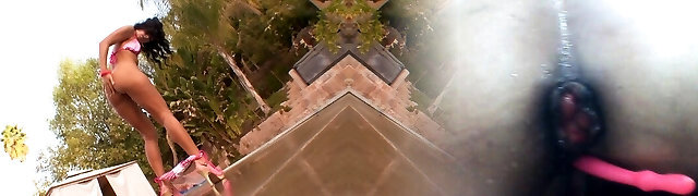 Beautiful bikini hottie Angel B flashes her pussy and flossy ass