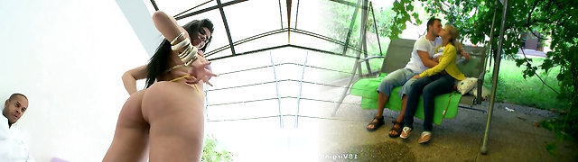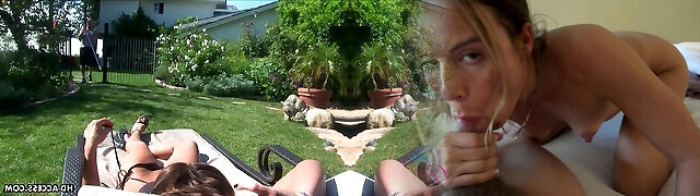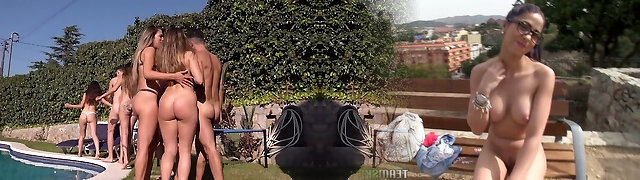 Tastey big bottomed chicks are fucked by one nasty stud be the pool side