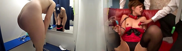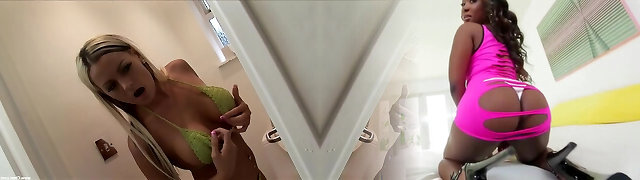 Mature cougar and her young daughter in a public fitting apartment. Different swimsuits and mini bikinis on sexy large ass.