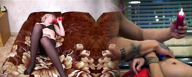 la muñeca joven se masturba y deja que el tipo le sorba la ranura