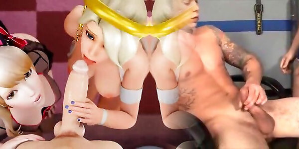 3d deux salopes asiatiques nues aux seins énormes suçant la grosse bite