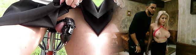 Shemale rides a bike with chastity belt and displays perky breasts in public