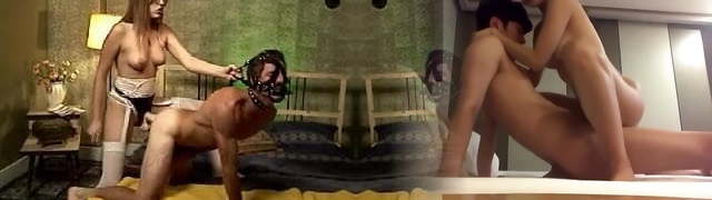 Threesome of two amateur being beaten in group sex.